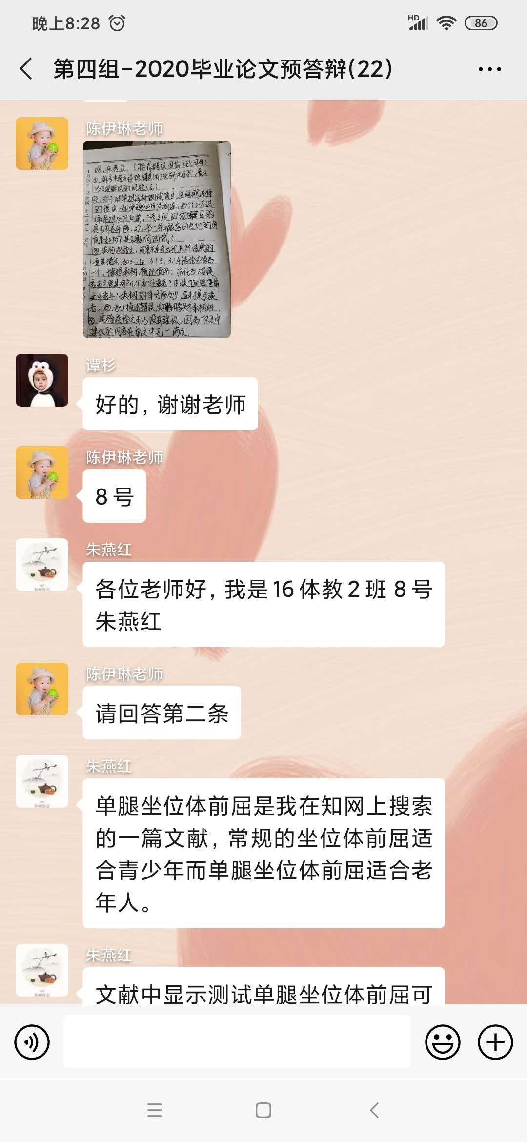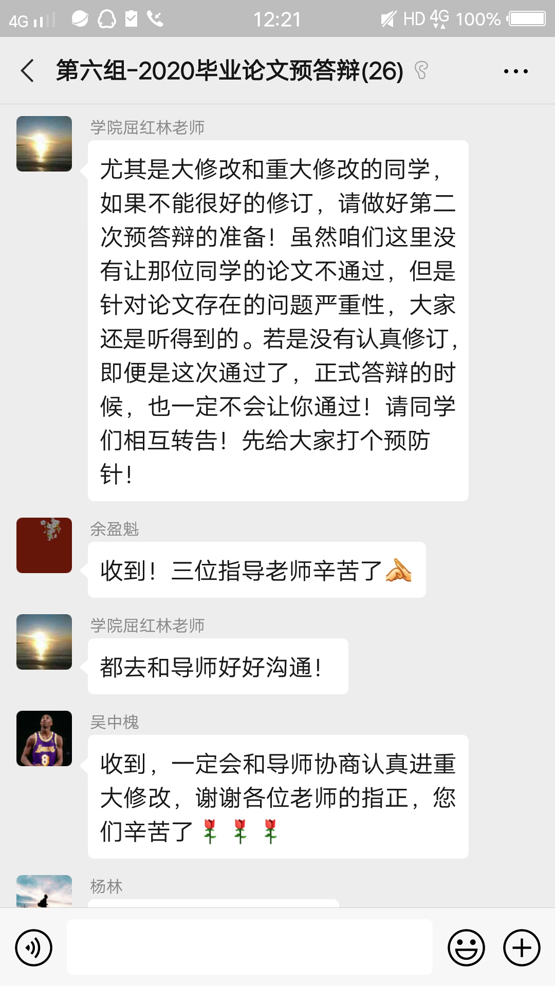 本次预答辩全程采用微信群平台进行在线答辩,通过学生提前录制答辩过程的视频在线共享方式,实现预答辩学生与答辩老师的实时交流。答辩过程中,由论文主评阅老师对学生的毕业论文进行点评和提问,高度还原了现场答辩的流程。评审老师在指出论文的亮点和不足的同时给同学们提了很多宝贵的经验和以及答辩的技巧,更是审时度势,以敏锐的视角给同学们提了很多建设性意见,同学们也得到了更多新的答辩技巧。同时,预答辩全场过程都进行了录音录像,截屏保留关键内容,将其与答辩记录一并留存,以确保整个答辩过程可回溯、可复查。所有学生答辩完成后,次日答辩组会在微信群发布答辩小结和学生答辩结果。