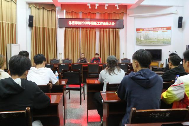 本站讯(学生记者 朱森林 刘琼)为确保2020年迎新工作的顺利开展,9月22日下午,体育学院在体育馆会议室召开2020年迎新工作动员大会,参加此次会议的有经过选拔的60名迎新工作志愿者,学工科团委负责人黎轶主持本次会议。