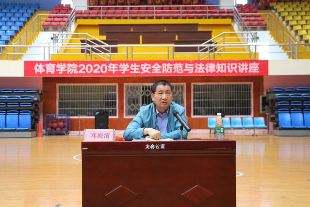本站讯(学生记者 徐杨 刘琼)为提高新生安全防范意识,提高自我保护能力,促进校园和谐稳定,巩固平安校园建设成果。9月28日,体育学院邀请学院派出所副所长邓海清警官在篮球馆进行了“安全防范与法律知识”专题讲座。