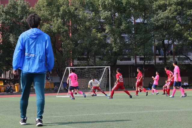 覆盖了一层薄霜的足球场,这是足球队清晨即将训练的场地。足球运动员成群相互练习“脚内侧传球”、“长传”等基本功,并通过模拟比赛提高队员的之间的相互配合能力。