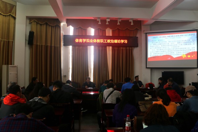 本站讯(学生记者 陈家乐)为提高体育学院全体教职工的政治理论素养,把政治理论学习常态化,1118日下午,体育学院在体育馆会议室召开十一月份全体教职工政治理论学习会议,党委书记谢军、院长龙建新出席本次会议,全体教职工参加会议,会议由专职组织员郭静老师主持。