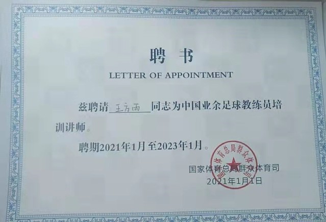 本站讯(学生记者 刘琼)为加大中国足球人才的培养力度,促进我国业余足球运动普及和发展人才发展,为全国业余足球教练员培训工作建好师资队伍,去年12月,国家体育总局司局发布了《体育总局群体司关于开展中国业余足球教练员培训讲师在线遴选工作的通知》,江西省体育局在接到有关通知后,推荐宜春学院王方雨老师参加培训。王方雨老师经过12天线上学习,结束培训后分组抽签专家线上考评,最终顺利通过考核。近日被国家体育总局群体司聘为中国业余足球教练员培训讲师。