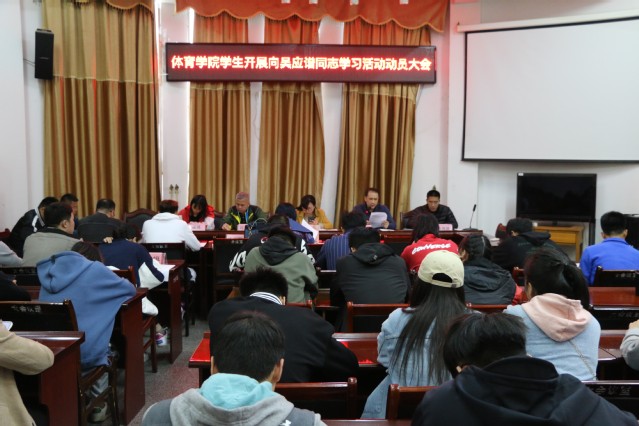 本站讯(学生记者 汪宇 祝文杰 李涛)4月7日下午,体育学院组织开展向吴应谱同志学习活动动员大会。参加本次会议的有院党委副书记于梅、学生事务办负责人黎轶、学工科老师刘显东、蒋晓波、谌琪及各班班主任,会议由学生事务办负责人黎轶主持。