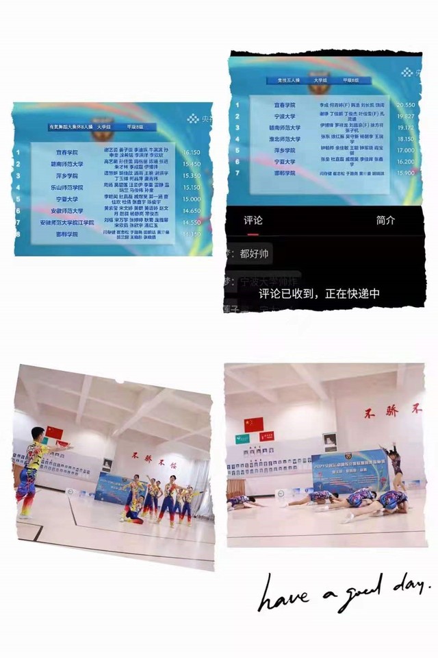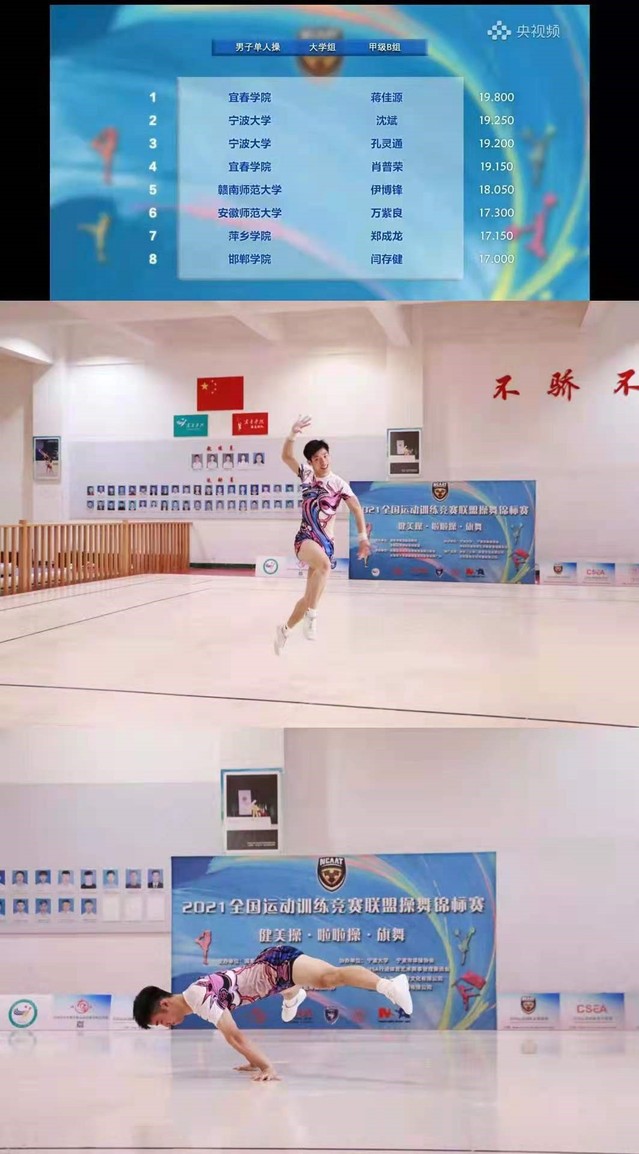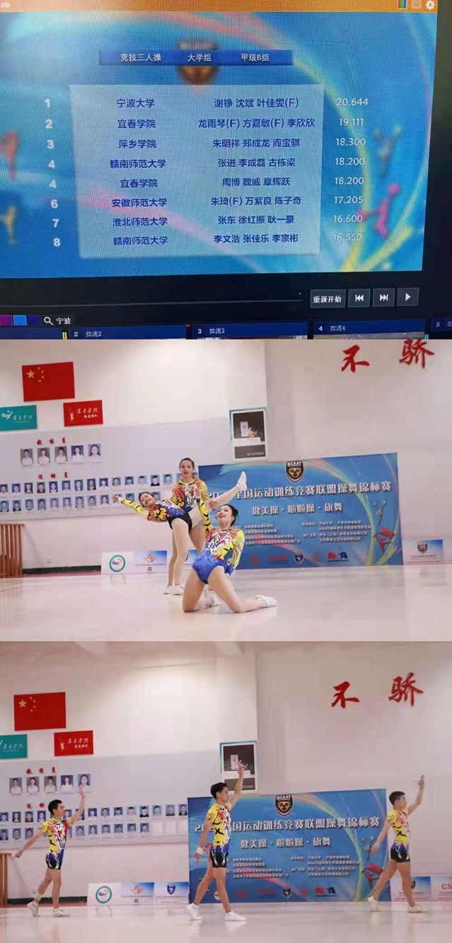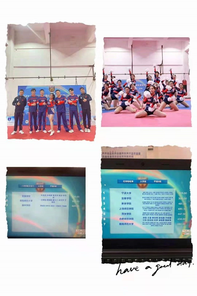 宜春学院健美操代表队与啦啦操代表队在此次比赛中获得了男子单人操第一名与第四名、女子单人操第二名与第四名、混双第二名与第三名、三人操第二名与第五名、五人操第一名、有氧舞蹈第一名、花球啦啦操第二名、小团体配合技巧第一名的好成绩,这一切都离不开参赛选手们平时的刻苦训练和临近比赛时的积极备战。