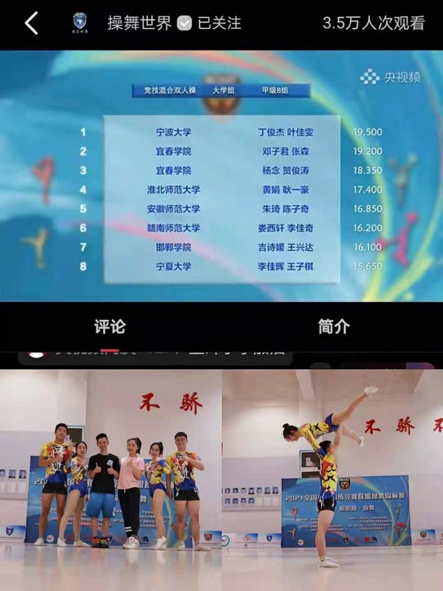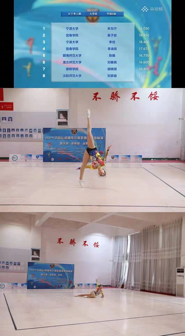 本站讯(学生记者 谢宇欣 陈家乐)2021年6月4日至2021年6月7日,为期4天的2021年全国运动训练竞赛联盟健美操比赛在央视频和各代表队所在地顺利举行。据悉本次赛事是由国家体育总局科教司、全国运动训练竞赛联盟主办,赛事吸引了宁波大学、淮北师范大学、赣南师范大学、安徽师范大学、天津体育学院、武汉体育学院、邯郸学院、宜春学院等众多高校参加,大赛不仅参与人数众多,更是集结各高水平运动员,可见竞争角逐之激烈,赛事规模之盛大。为防控疫情,比赛采用了线下各代表队所在地比赛,线上直播的形式举行。