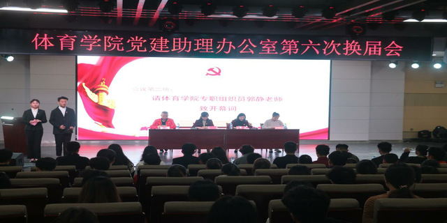 本站讯(学生记者 陈家乐 傅宣腾 欧阳瑜)10月15日晚,宜春学院体育学院党建助理办公室第六次换届大会在大学生活动中心三楼共青团发展中心顺利举行,出席本次会议的有院党委副书记于梅、专职组织员郭静老师、学生二支部书记刘显东老师、学生一支部书记谌琪老师等。
