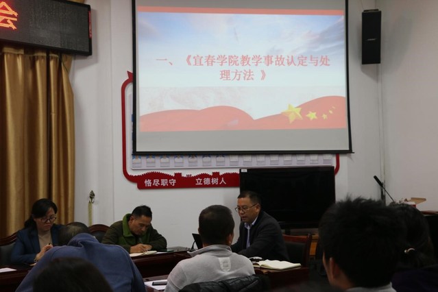 本次会议主要学习《宜春学院教学事故认定与处理办法》《宜春学院教师教学工作规范》的有关内容,体育学院副院长屈红林先是对两篇文章学习的内容和要求进行了讲解,并用PPT的方式放映学习内容。