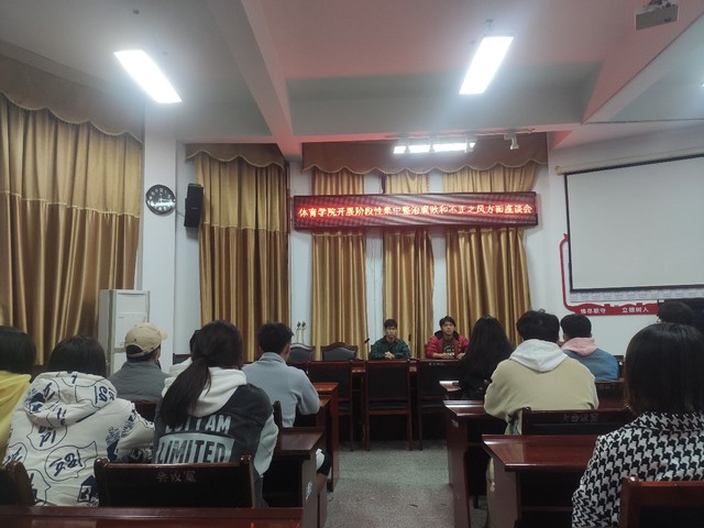 本站讯(学生记者 谢宇欣)11月20日,体育学院在体育馆会议室召开集中整治群众身边腐败和不正之风突出问题座学生谈会。会议由体育学院学生会执行主席章宇主持,学生会权益部及各班学生代表参加此次会议。