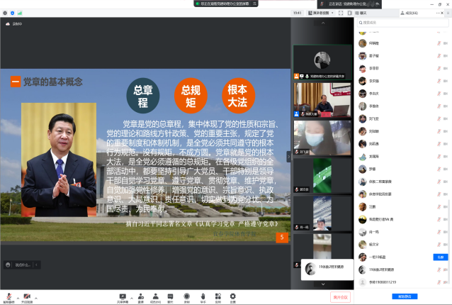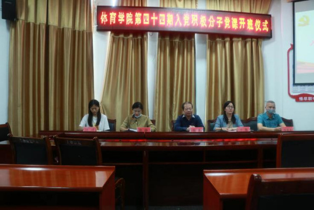 本站讯(党建办公室 供稿)为进一步做好入党积极分子教育培训工作,加强入党积极分子对党的全面认识,体育学院于2022年5月25日下午2点在体育馆会议室采取线上线下结合的方式开展第四十四期入党积极分子党课培训班开班仪式。出席本次党课的老师有:院党委书记谢军、院党委副书记于梅、学生一支部书记谌琪、学生二支部书记刘显东、全体培训班成员参加本次培训。开班仪式由院专职组织员郭静主持。