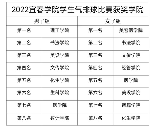 通过本次比赛,不仅增强了学生之间的相互交流与协作和集体的凝聚力,更为学校创造良好和谐高效的学习氛围注入了新鲜活力,展现了学生们团结互助、勇于拼搏的体育精神。经过四天的激烈角逐及裁判员的辛苦付出,宜春学院2022年学生气排球比赛取得圆满成功。