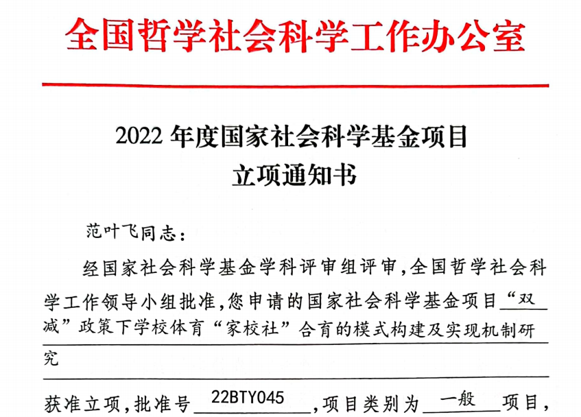 2022年9月30日,体育学院副院长范叶飞教授主持的 “双减”政策下学校体育“家校社”合育的模式构建及实现机制研究 项目荣获2022年国家社会科学基金一般项目立项。据悉,国家社科基金项目是我国人文社会科学领域级别最高、分量最重的国家级研究项目,代表了人文社会科学研究的国家水准。2017年韩磊磊博士开创了体育学院立项国家社会科学基金青年项目类别的先河。范叶飞教授该课题立项则是体育学院在国家社会科学基金一般项目类别的首次突破。体育学院将一如既往地高度重视科研项目的申报立项工作,在广泛动员的基础上进行全局谋划,以保质保量的科研项目促进学科建设发展。