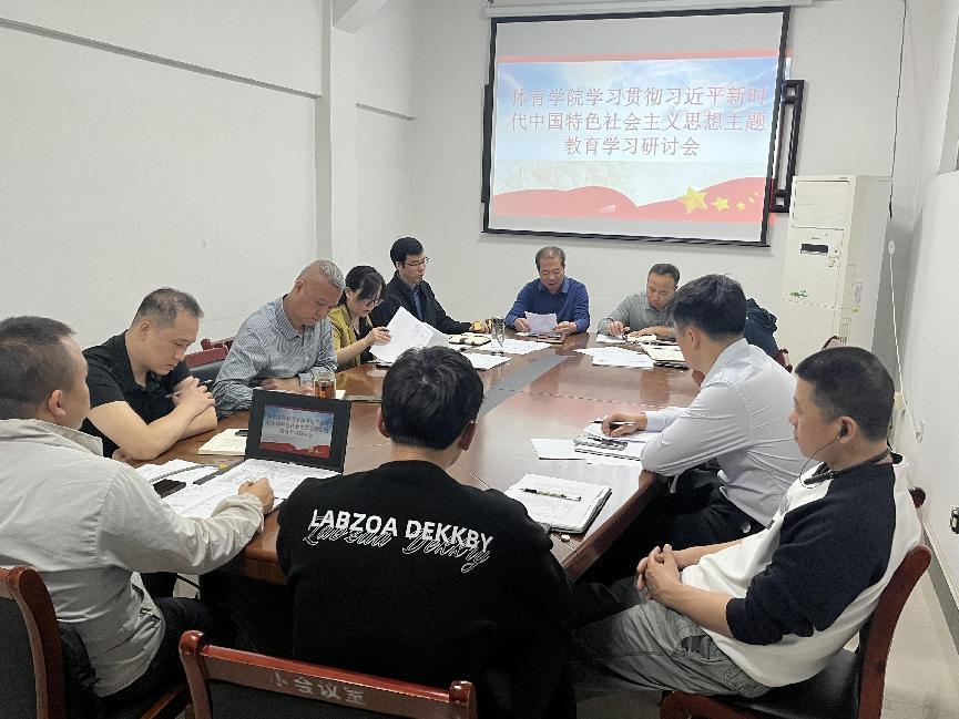 本站讯(学生记者 温焕)5月10上午,体育学院全体党政班子成员在体育馆小会议室开展学习贯彻习近平新时代中国特色社会主义思想主题教育学习研讨会。会议由党委书记谢军主持。