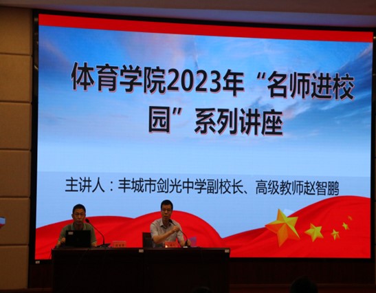 本站讯(学生记者 周成庚)2023年6月9日上午,在科技楼二楼学术报告厅,丰城市剑光中学副校长、高级体育教师赵智鹏应邀来我校开展有关体育教育专业素养的讲座。讲座由体育学院副院长范叶飞主持,体育学院部分教师和科室负责人及2020级体育教育专业全体学生参加。
