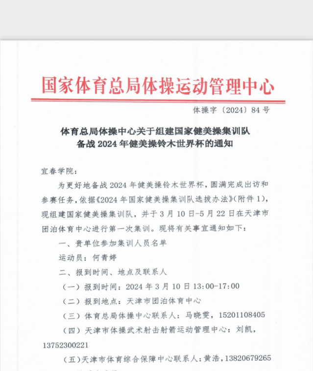 3月6日,宜春学院收到关于《体育总局体操中心组建国家健美操集训队备战2024年健美操铃木世界杯的通知》,我校体育学院2020级学生何青婷入选国家健美操集训队,并将备战参加2024年健美操铃木世界杯。