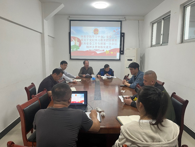 本站讯(学生记者 温焕)4月15日上午,体育学院在体育馆小会议室开展学习中央、省委、市委关于党纪学习教育的部署要求和省委工作专班第一次会议精神及贯彻落实意见会议,参加会议的有院全体党委成员,本次会议由院党委书记谢军主持。