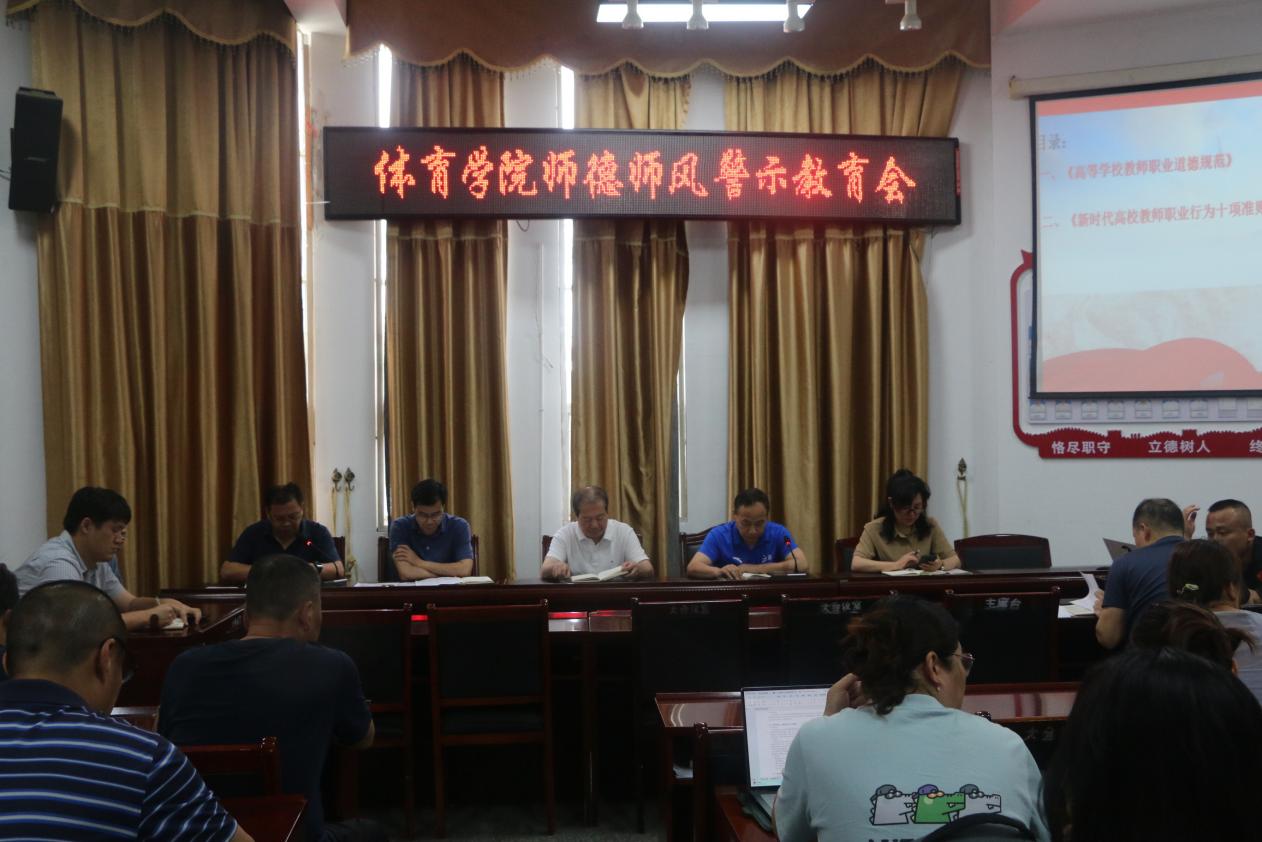 本站迅(学生记者 刘亦青 胡裕元)为进一步加强师德师风建设,规范教师行为,提升教师职业道德修养,5月29日下午,体育学院在大会议室召开体育学院师德师风警示教育会。参加本次会议的有体育学院领导班子成员以及全体教职工,会议由院长龙建新主持。