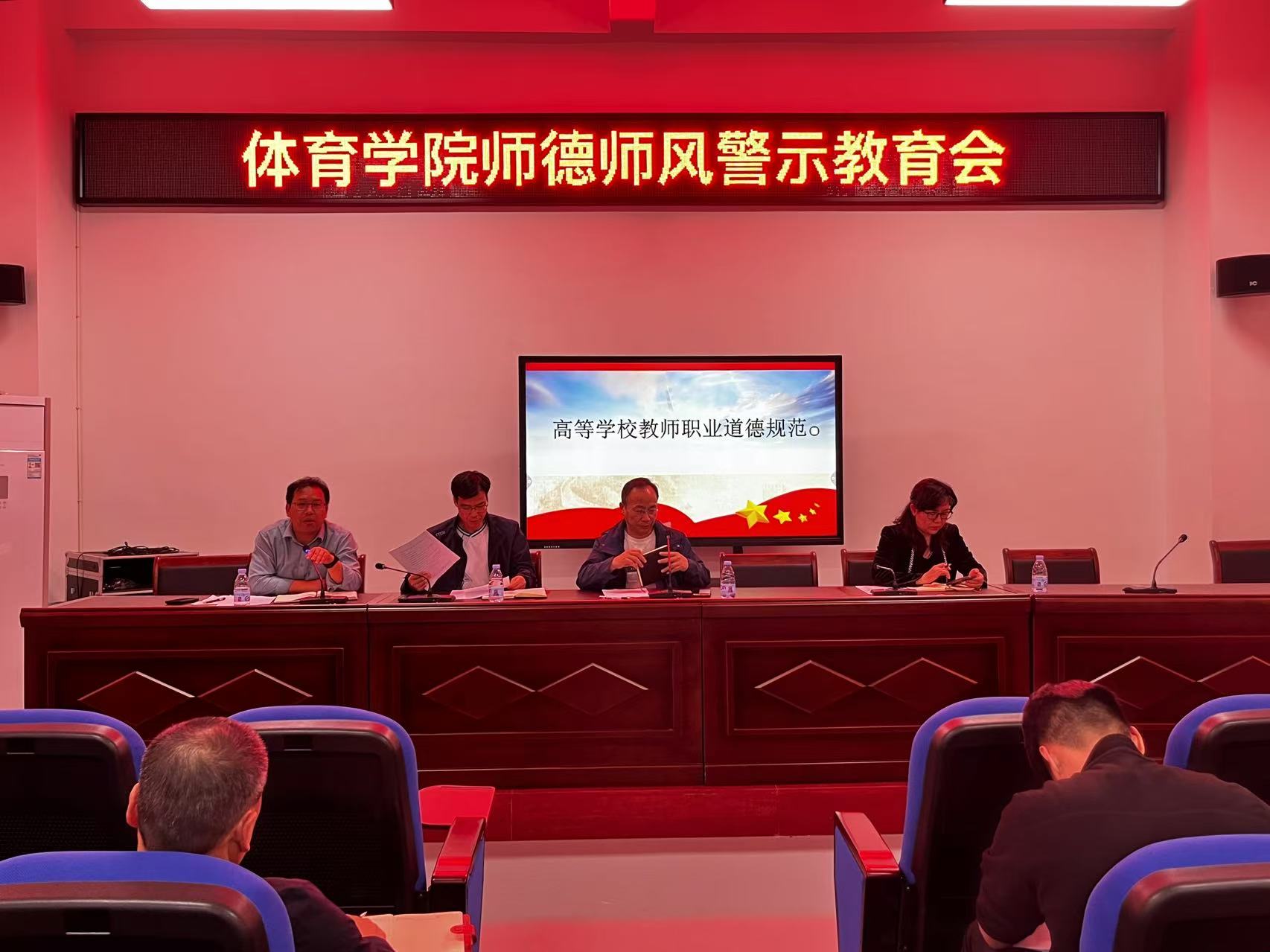 本站讯(学生记者 刘艳 潘俊杰)为进一步加强师德师风建设、强化典型案例警示教育、弘扬优良师德师风,4月9日下午体育学院在大会议室召开师德师风警示教育会。参加本次会议的有领导班子以及全体教职工,会议由院长龙建新主持。