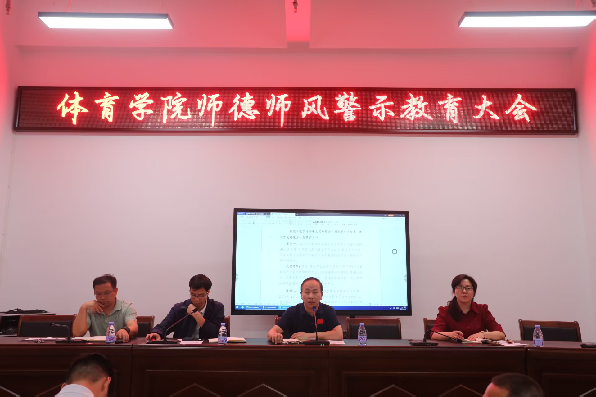 本站迅(学生记者 颜丹 黄天玮)为进一步加强师德师风建设,规范教师行为,提升教师职业道德修养,4月30日下午体育学院在文化艺术中心E203召开体育学院师德师风警示教育大会。参加本次会议的有体育学院领导班子成员以及体育学院全体教职工,会议由院长龙建新主持。