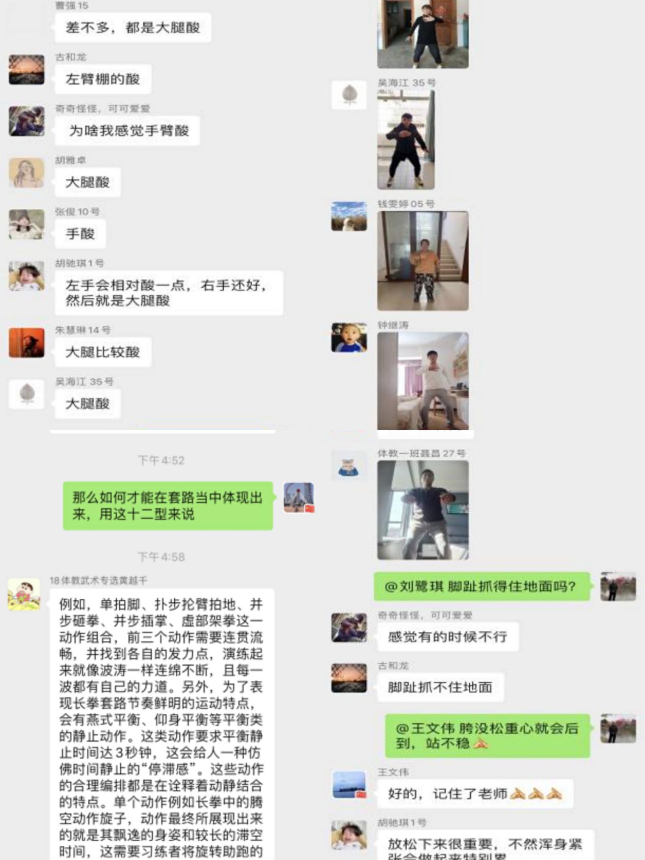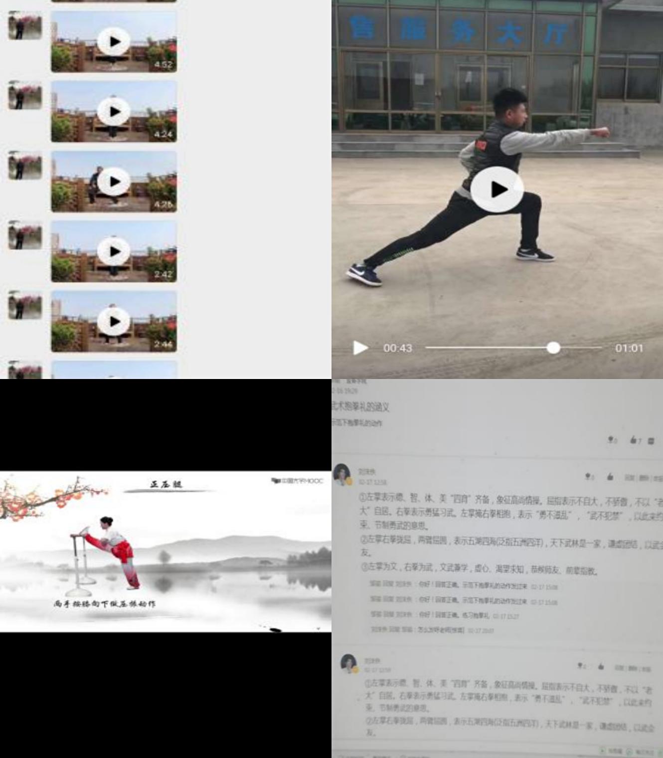 克服疫情带来的各种困难自学校下达开展线上教学的通知起,体育学院武术教学团队第一时间建立了团队微信网课工作群,制定多种方案并进保证课堂“不掉线”,每天以视频交流进行网课教研活动,研讨如何上好线上课,并自我加压挖潜,整合内外教学资源,制作以团队老师主讲的校本教学视频30余个,满足本学期武术技术课教学需求使网课真正落地实处。在实际教学中,教师以教学质量和教学效果为中心,根据实际情况灵活运用学习通、微信等多个网络平台进行考勤、授课、互动、作业布置和疫情防控宣传等,充分确保了课堂教学质量和教学效果。一些教师还发挥网络平台的视频直播功能,用直播的方式给学生进行动作指导,并实时查看和纠正学生的技术动作,让专项课也能在线上“活起来”。
