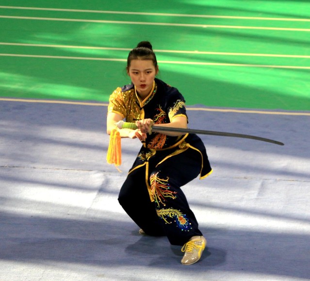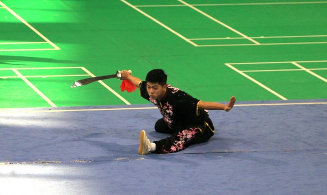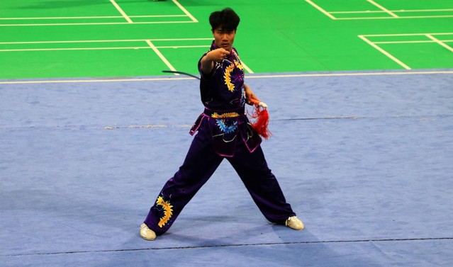 赛场上,宜春学院武术队的选手个个精神抖擞,动作铿锵有力,拳法刚柔并济,举手、抬脚、弯腰、转身、跳跃,每个动作都刚劲有力,刀、枪剑、南刀各种器械在武者手中挥舞,尽显中华武术人独有的风貌。行云流水的武技不时博得现场观众的阵阵掌声,让现场观众大呼过瘾。