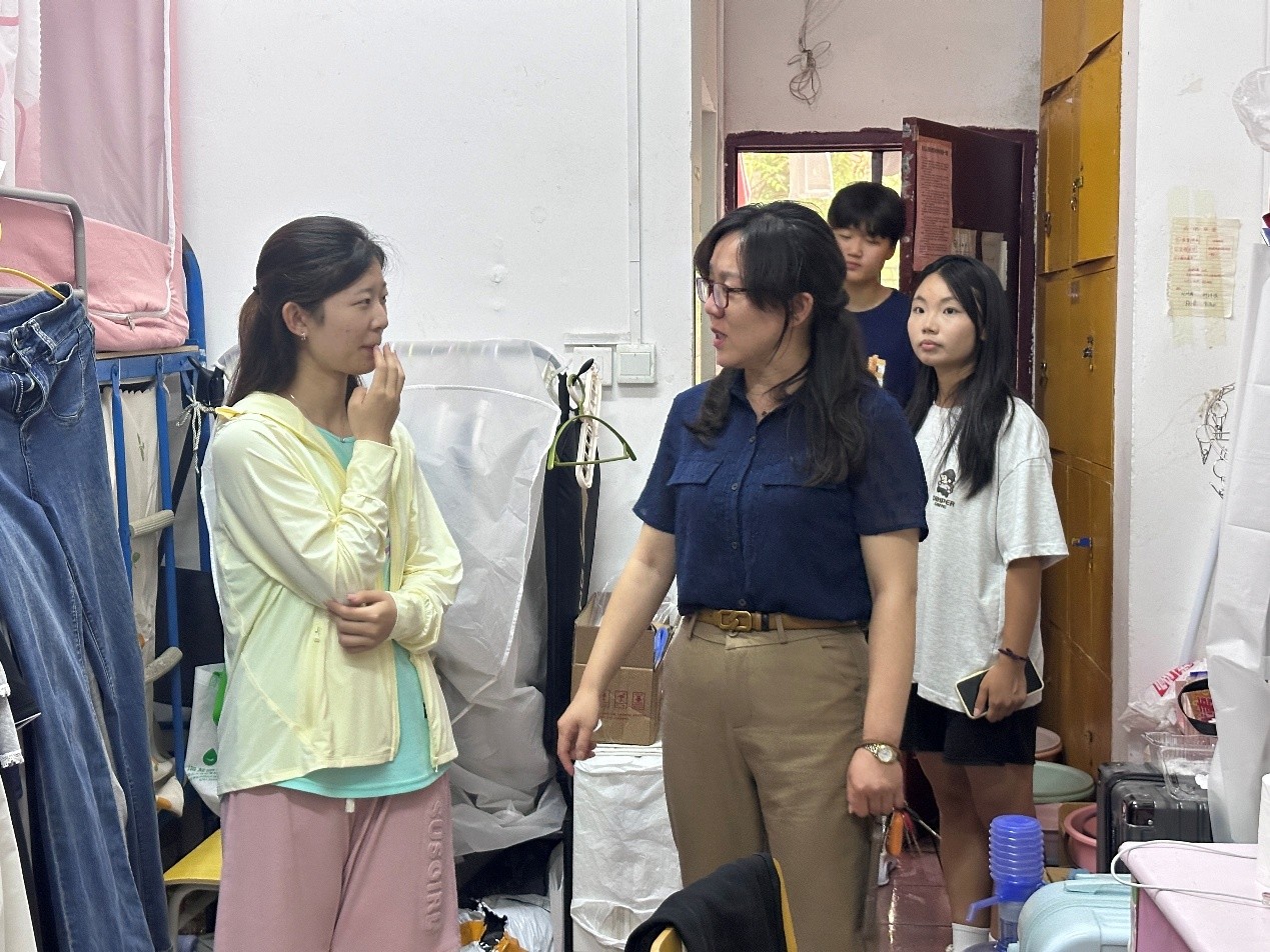 本站讯(学生记者 胡家鹏 颜丹)为全方位、深入的了解学生在校园中的学习进展与生活状况,精准把握学生需求,进一步织密宿舍安全防护网,切实强化宿舍安全管理工作,营造安全、和谐、温馨的宿舍环境,6月13日下午,体育学院党委书记屈红林、院长范叶飞以及党委副书记于梅怀揣着对学生的深切关怀,一同前往学生宿舍开展走访慰问活动。他们带着对学生成长的殷切期望,旨在通过实地走访,拉近与学生的距离,为学生送去温暖与鼓励。