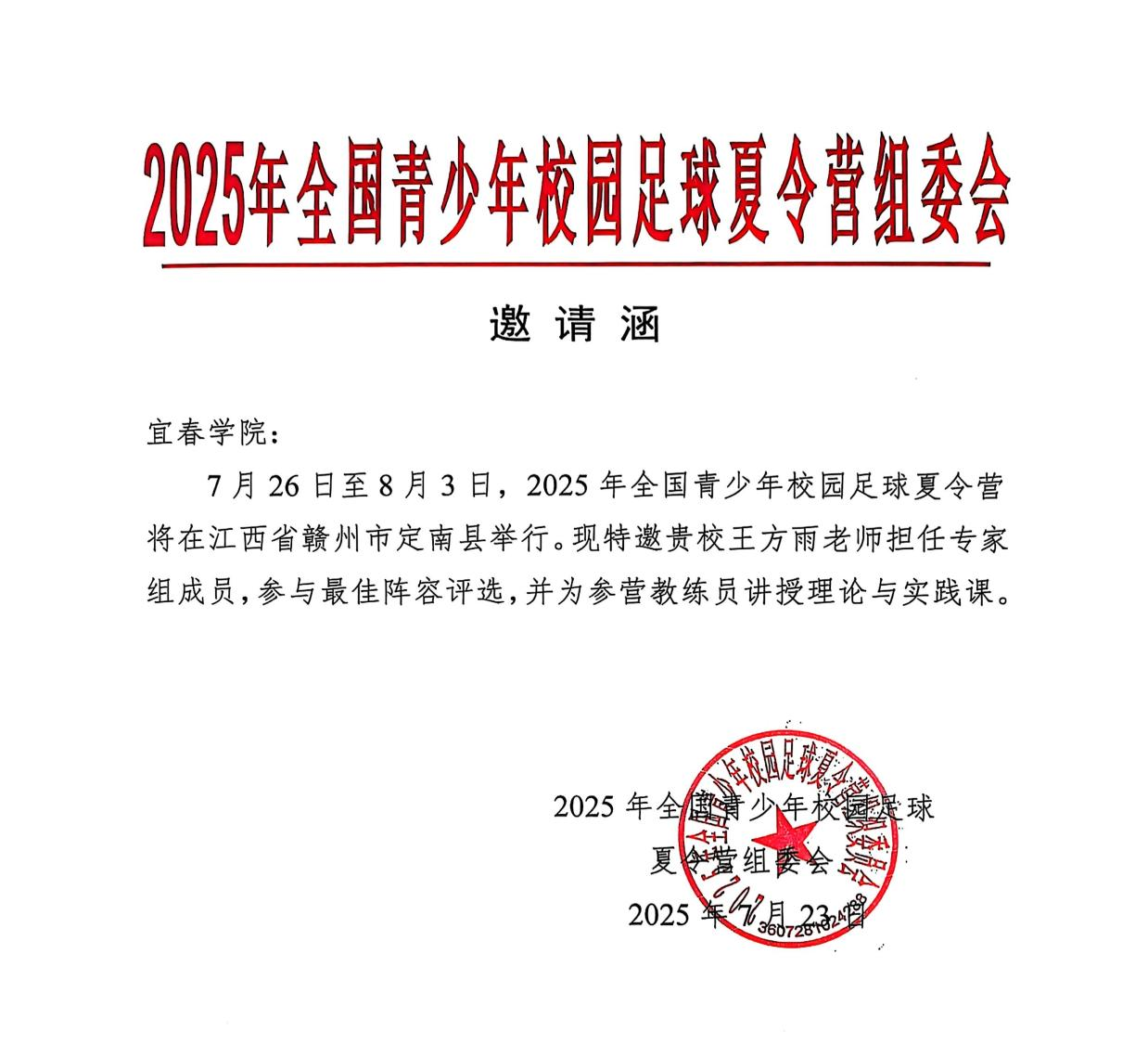 本站讯(学生记者 颜丹 罗圣鹏)2025年7月26日至8月3日,由教育部体育卫生与艺术教育司、江西省教育厅主办,赣州市教育局与定南县人民政府联合承办的全国青少年校园足球夏令营在江西省赣州市定南县举行。本次夏令营以“薪火相传,‘足’梦未来”为主题,汇聚全国800余名师生参与(包括港澳),其中我校体育学院王方雨老师作为高中组选拔工作组成员,全程参与了营员的评估与指导工作。