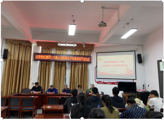 为牢固树立党章意识,提高全体入党积极分子的党性修养,体育学院于5月22日在体育馆会议室举行第四十六期入党积极分子培训班开班仪式。参加本次开班仪式的有体育学院党委书记谢军,院长龙建新,党委副书记于梅,院长龙建新,专职组织员李扬,由党委书记谢军主持。