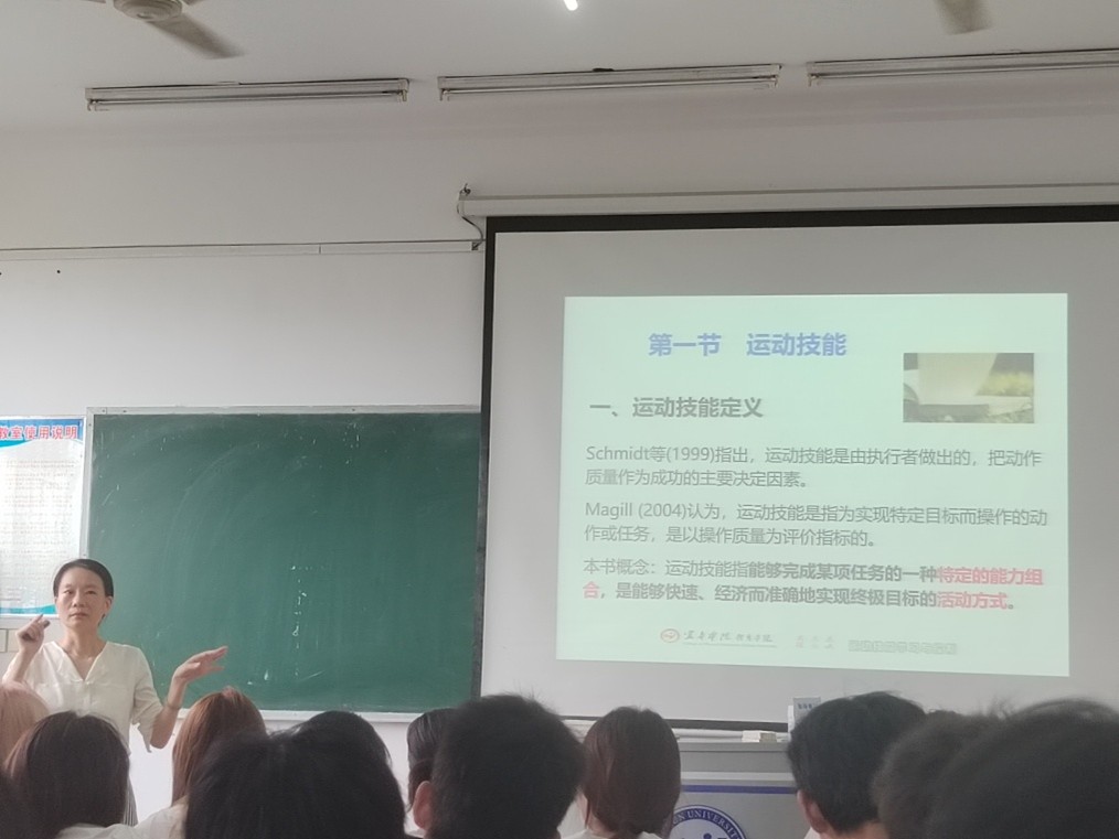 在主教楼S221教室, 理论教研室老师们全程倾听了贺立娥教师为2023级体育教育1班主讲的《运动技能学习与控制》课程。课堂伊始,贺老师先带领同学们回顾了前期学习的相关基础课程,帮助学生快速衔接新旧内容,随后以篮球、足球等项目的运动技能学习为切入点,将同学们引入到本学期《运动技能学习与控制》的课程。并结合学生自身运动技能学习经历,引导学生思考运动技能形成的内在逻辑,同时明确了本课程的学习内容及课程考核要求。贺老师课前准备充分,教学状态良好,课堂收放自如。学生精神状态饱满,课堂气氛活跃。