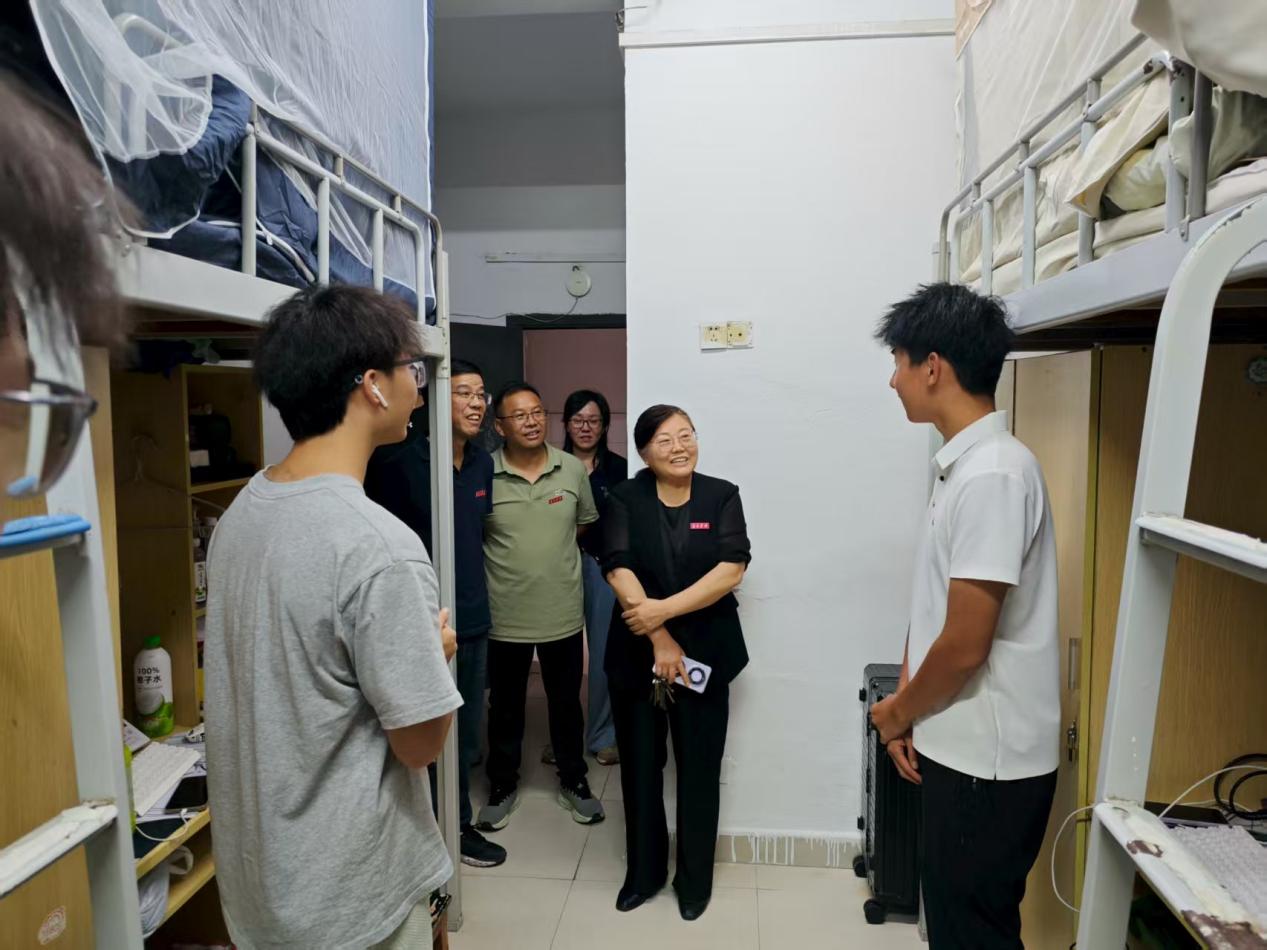 走进宿舍,余校长首先关切地询问新生们来自哪里、行李是否安置妥当、住宿环境是否习惯。看到同学们脸上洋溢的朝气,余校长欣慰地讲到:“宿舍是大家大学四年的‘第二个家’,希望你们在这里不仅能收获知识,更能结识挚友、共同成长。离家求学难免会想家,但在学校遇到任何困难,都可以随时找辅导员、找宿管阿姨,学校永远是你们的坚强后盾。”在走访新生宿舍时,余校长特意叮嘱同学们要主动与室友沟通磨合,营造团结友爱的宿舍氛围。她还鼓励新生们珍惜大学时光,既要认真学好专业知识,也要积极参与社会实践,全面提升自身能力,在大学舞台上绽放光彩。