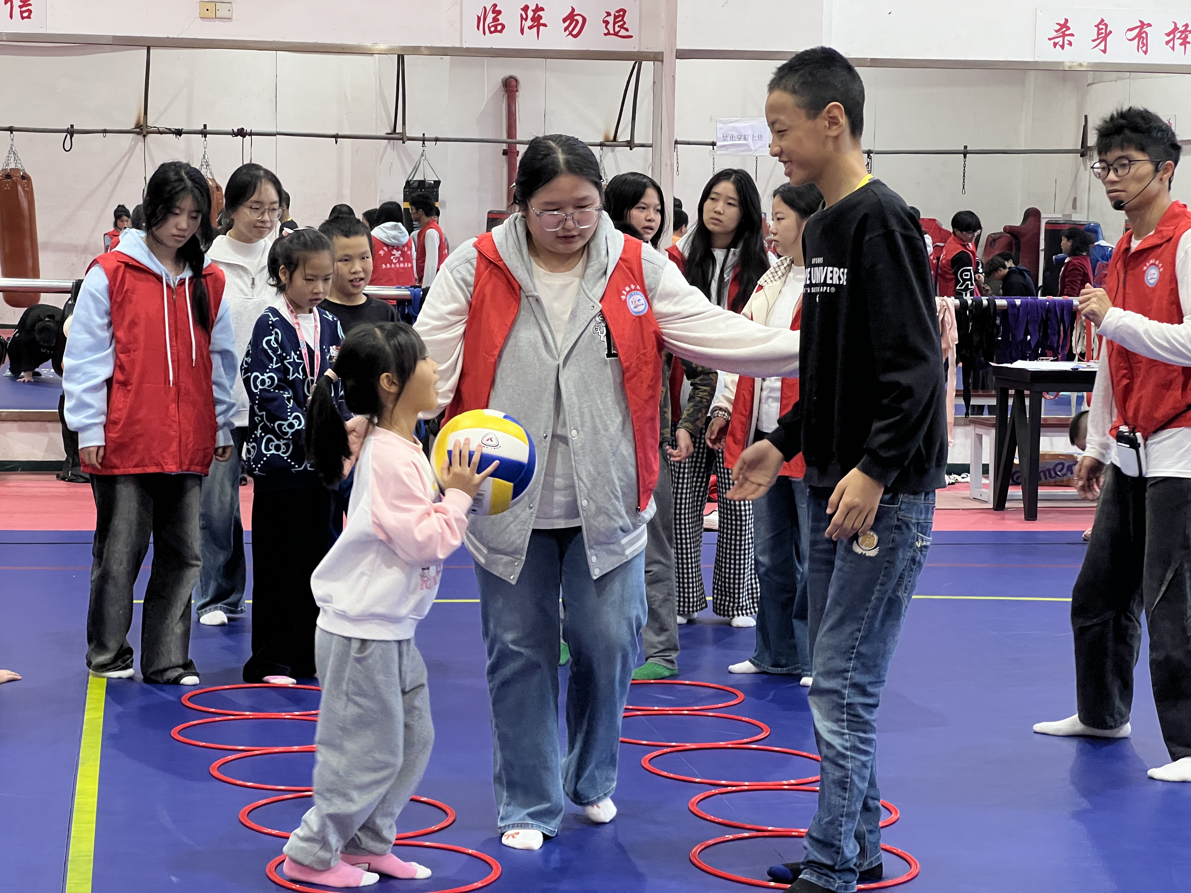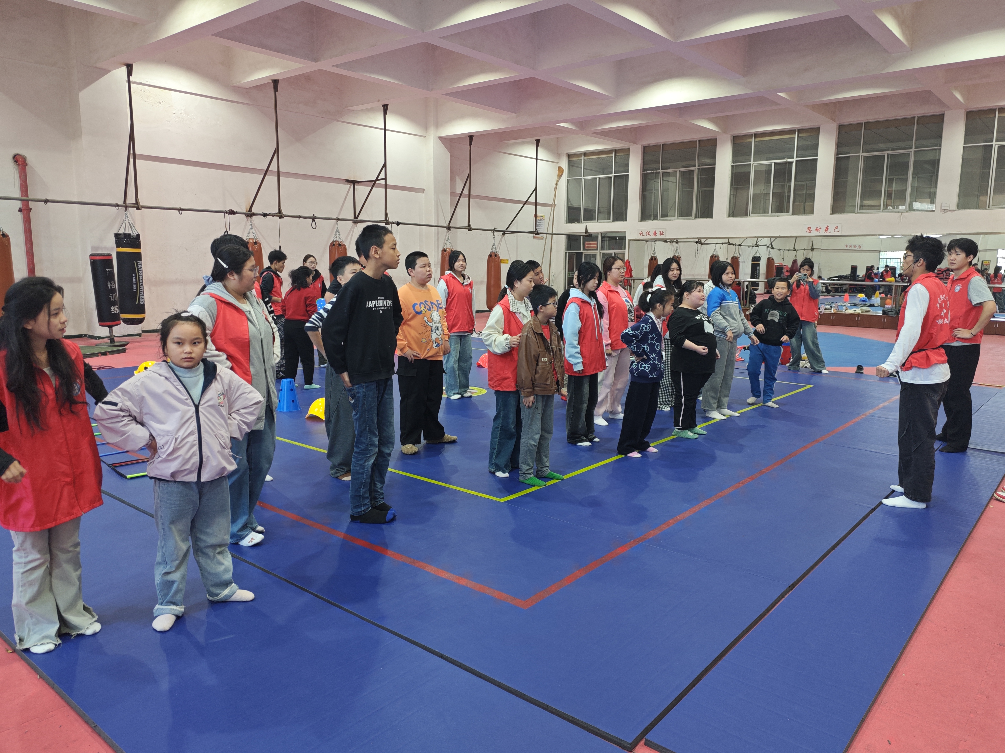 2025年11月16日上午,初冬的暖阳映照着充满活力的校园,宜春学院体育馆内一派热火朝天的景象,2023级体教学生温芳荣、2023级思政学生康博文正在为14名特需儿童开展精心设计的“特需儿童运动赋能成长营”系列公益课。该课程以体能运动助力特需儿童成长,同时让陪伴他们的家长得以暂缓压力,“喘口气”。