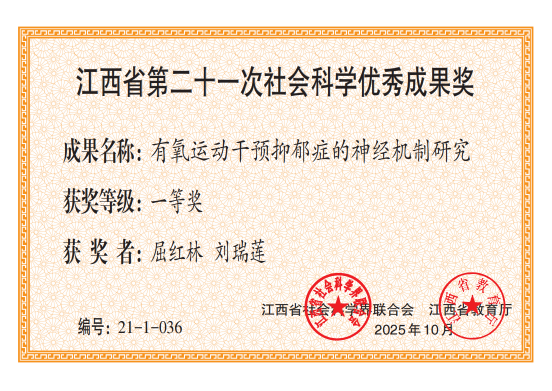 本站讯(学生记者 高悦 曹旭)近日,江西省社会科学界联合会与江西省教育厅联合公布《关于公布江西省第二十一次社会科学优秀成果奖获奖项目的通知》,我院屈红林教授的成果《有氧运动干预抑郁症的神经机制研究》荣获一等奖。作为江西省哲学社会科学研究领域的最高奖项,该荣誉每两年评选一次,学术权威性强、获奖难度大,充分彰显了成果在相关研究领域的高认可度与学术影响力。