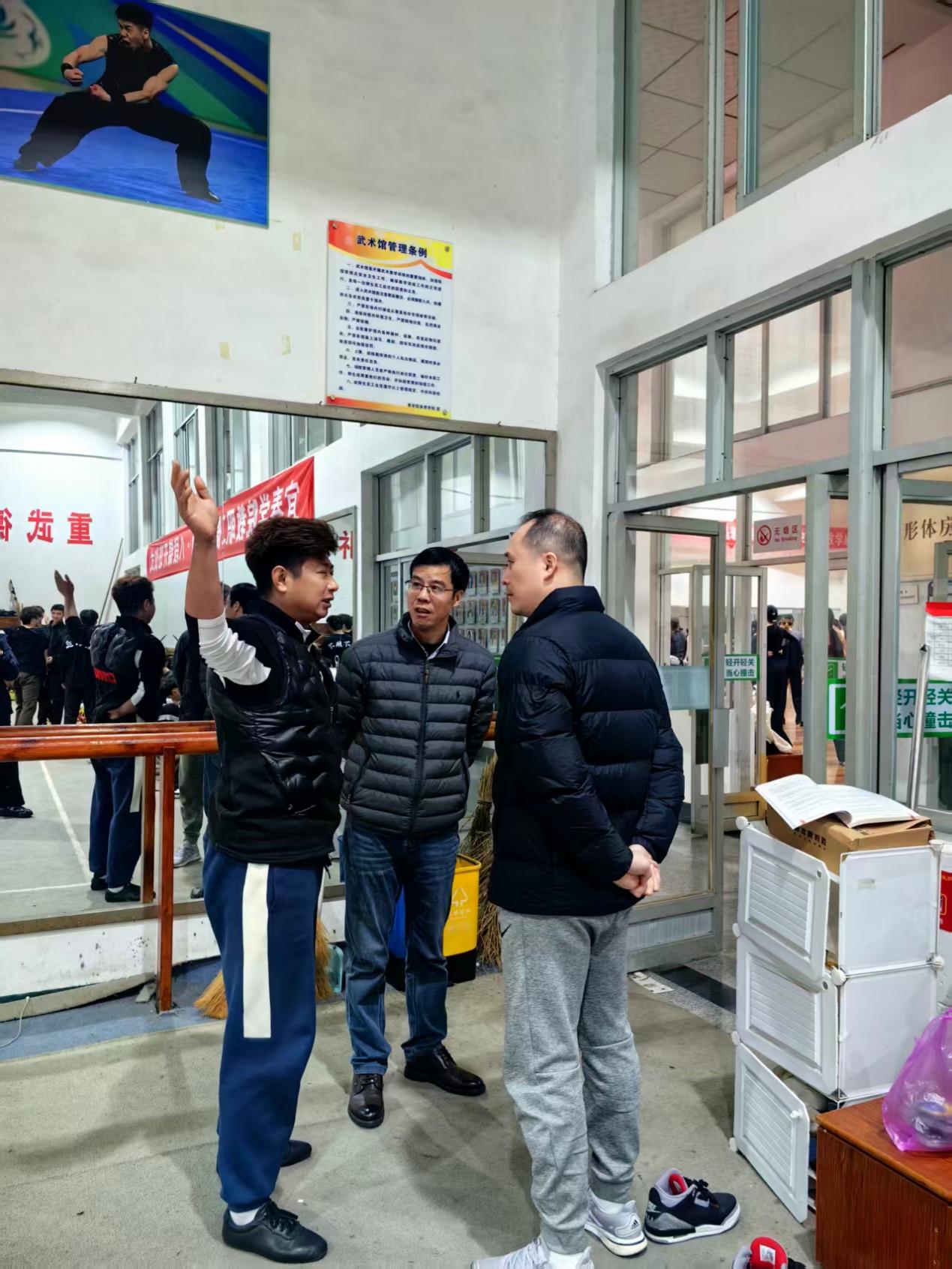 3月10日晚,体育学院院长范叶飞、副院长黎轶带队深入训练一线,对学院散打、武术、健美操、篮球、排球、羽毛球、网球等运动队的训练工作开展专项督查,实地把脉指导备战训练推进情况。